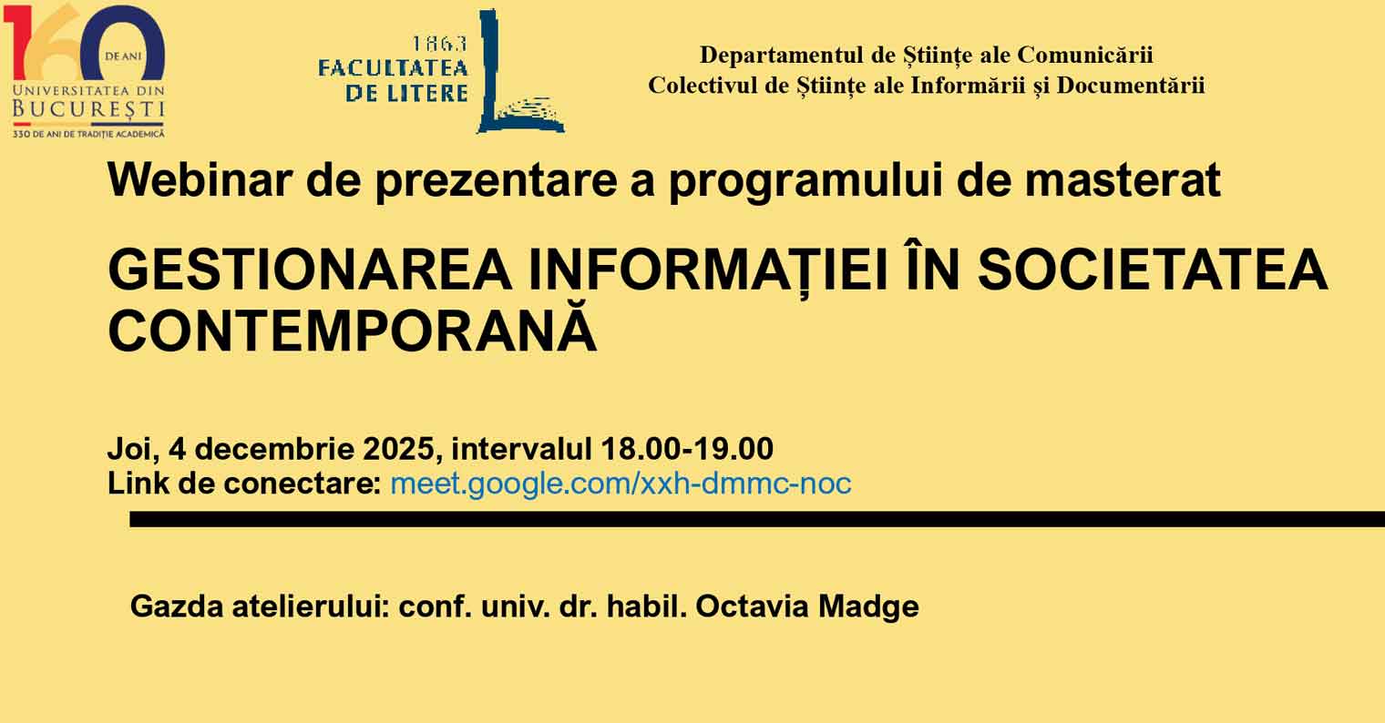 Webinar de prezentare a programului de masterat GESTIONAREA INFORMAȚIEI ÎN SOCIETATEA CONTEMPORANĂ Joi, 4 decembrie...
