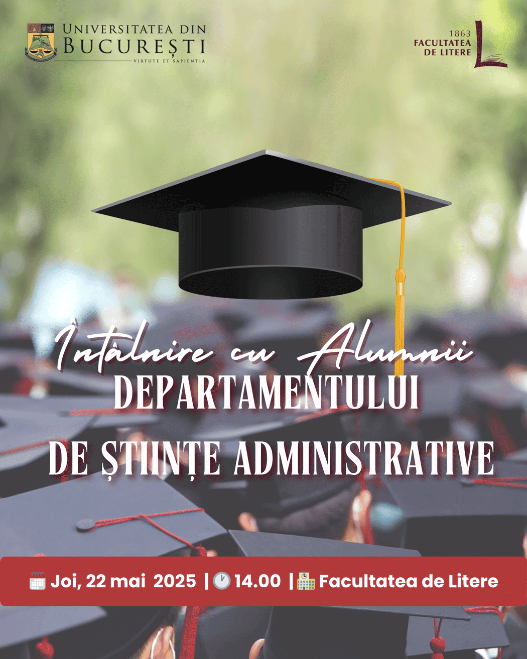 📰 Întâlnire cu Alumnii Departamentului de Științe Administrative | 📅 Joi, 22 mai 2025 | 🕛 ora 14.00 | 🏫 Facultatea de Litere