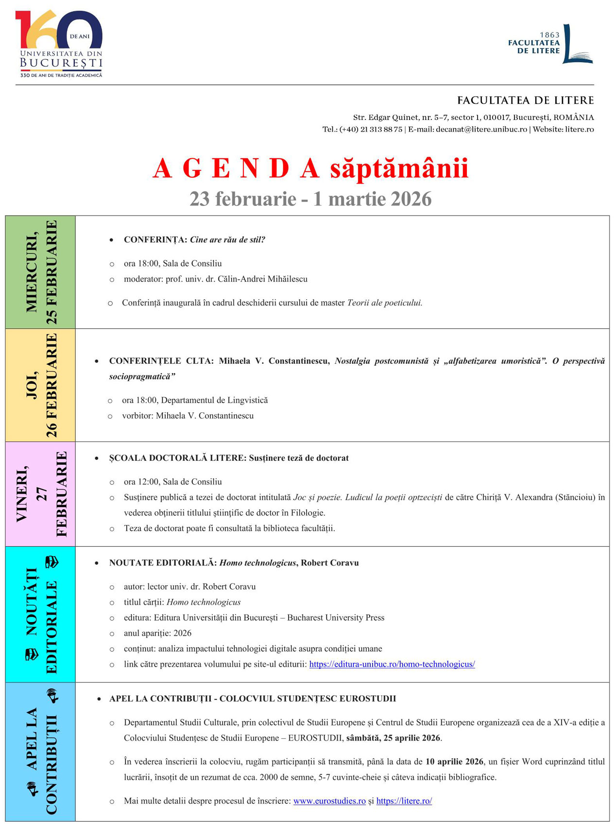 • Literele bucureștene. 160 de ani de existență – evenimente aniversare