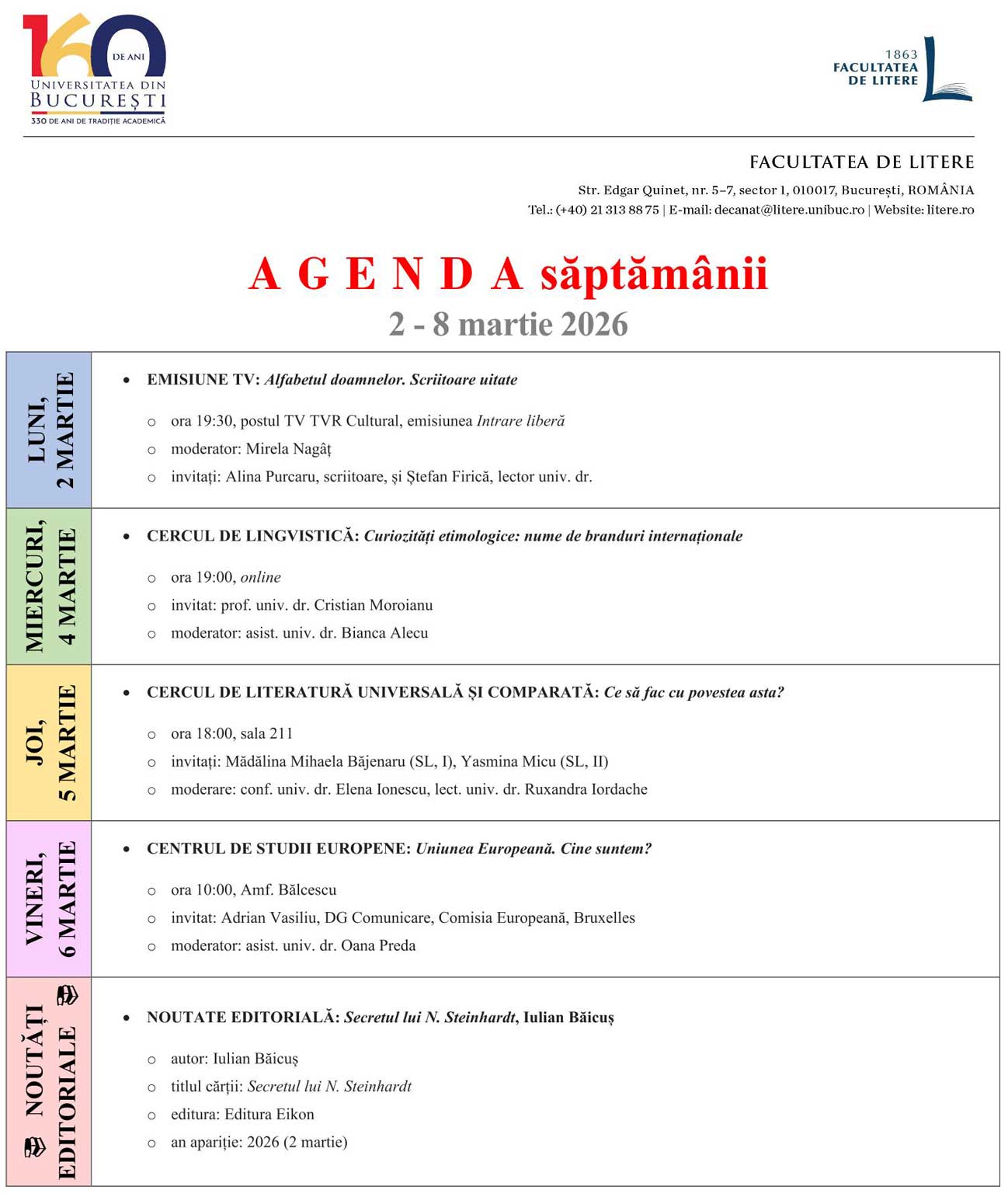 📔 Agenda săptămânii | 📅 2 – 8 martie 2026 March 2, 2026 Cristi 🔗 Click aici pentru mai multe detalii.