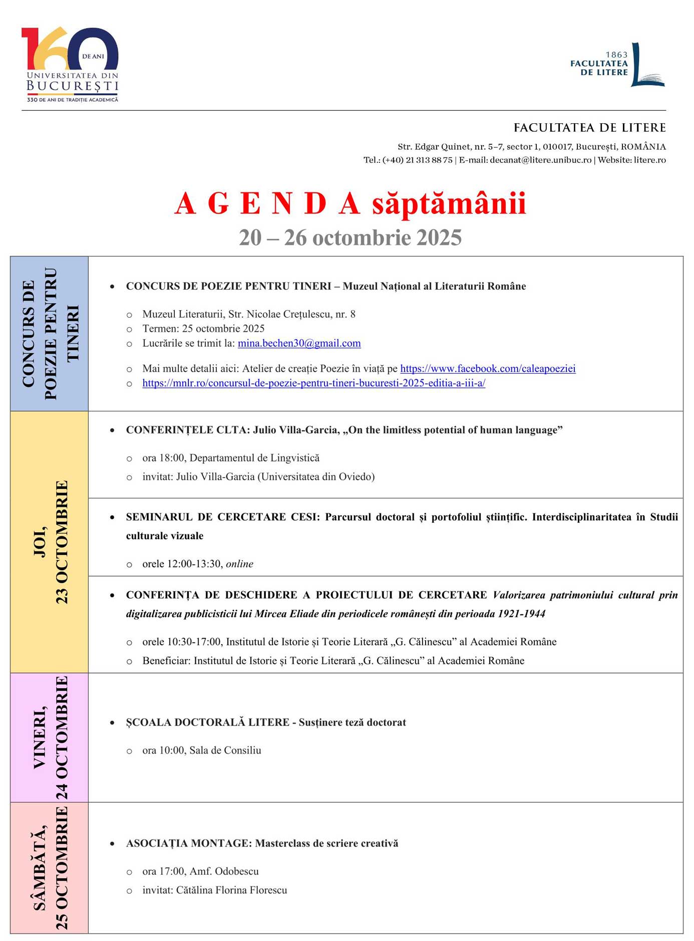 📔 Agenda săptămânii | 📅 13 – 19 octombrie 2025 October 13, 2025October 13, 2025 Cristi 🔗 Click aici pentru mai multe detalii.