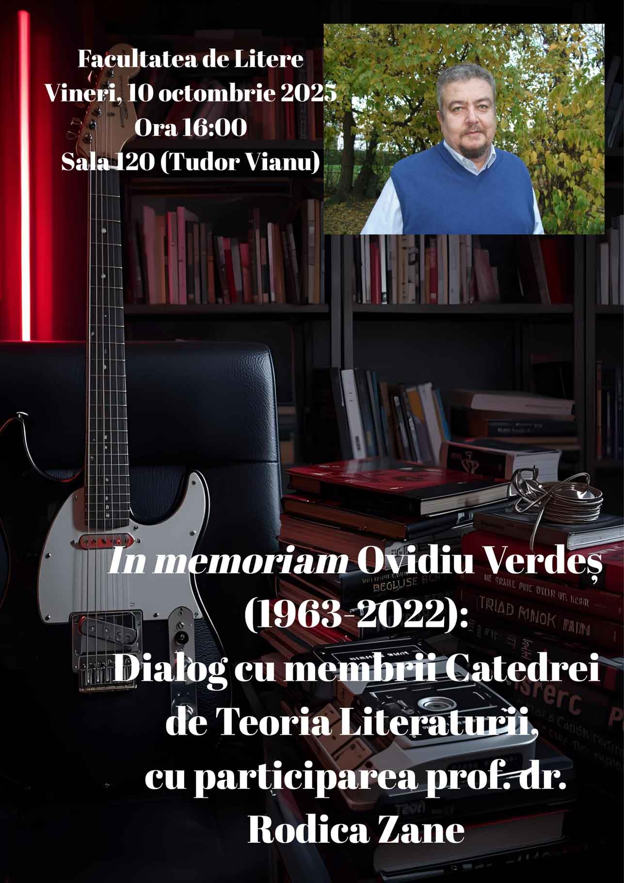📰 Trei ani de la plecarea lui Ovidiu Verdeș. Rememorări: dialog cu membrii Catedrei de Teoria Literaturii, cu participarea prof. dr. Rodica Zane | 📅 Vineri, 10 octombrie 2025 | 🕐 ora 16:00 | Sala 120 (Tudor Vianu)