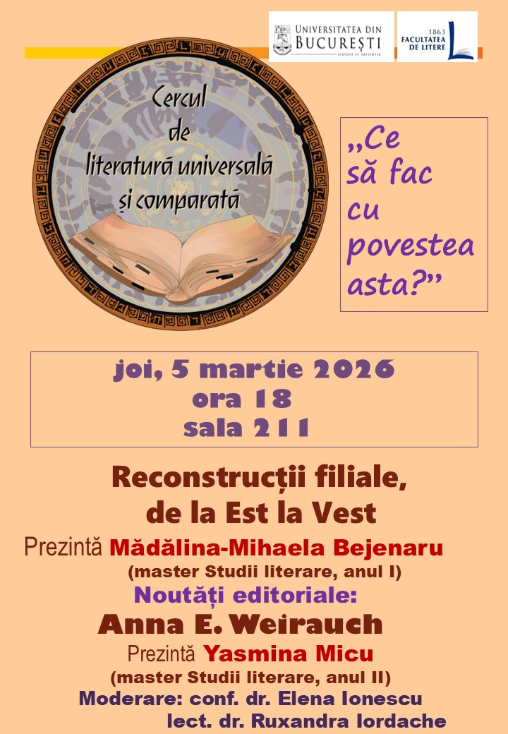 – descrierea evenimentului: Pentru noua întâlnire a Cercului de literatură universală și comparată masteranda Mădălina Mihaela Băjenaru (Studii literare, anul I) propune direcții ale prozei recente, urmărind modul în care aceasta este interesată de prezența celuilalt în mentalul european. Prezentarea va dezvolta teoria lui Dominique Viart despre narațiunile filiale, orientând-o spre proza migrantă contemporană.