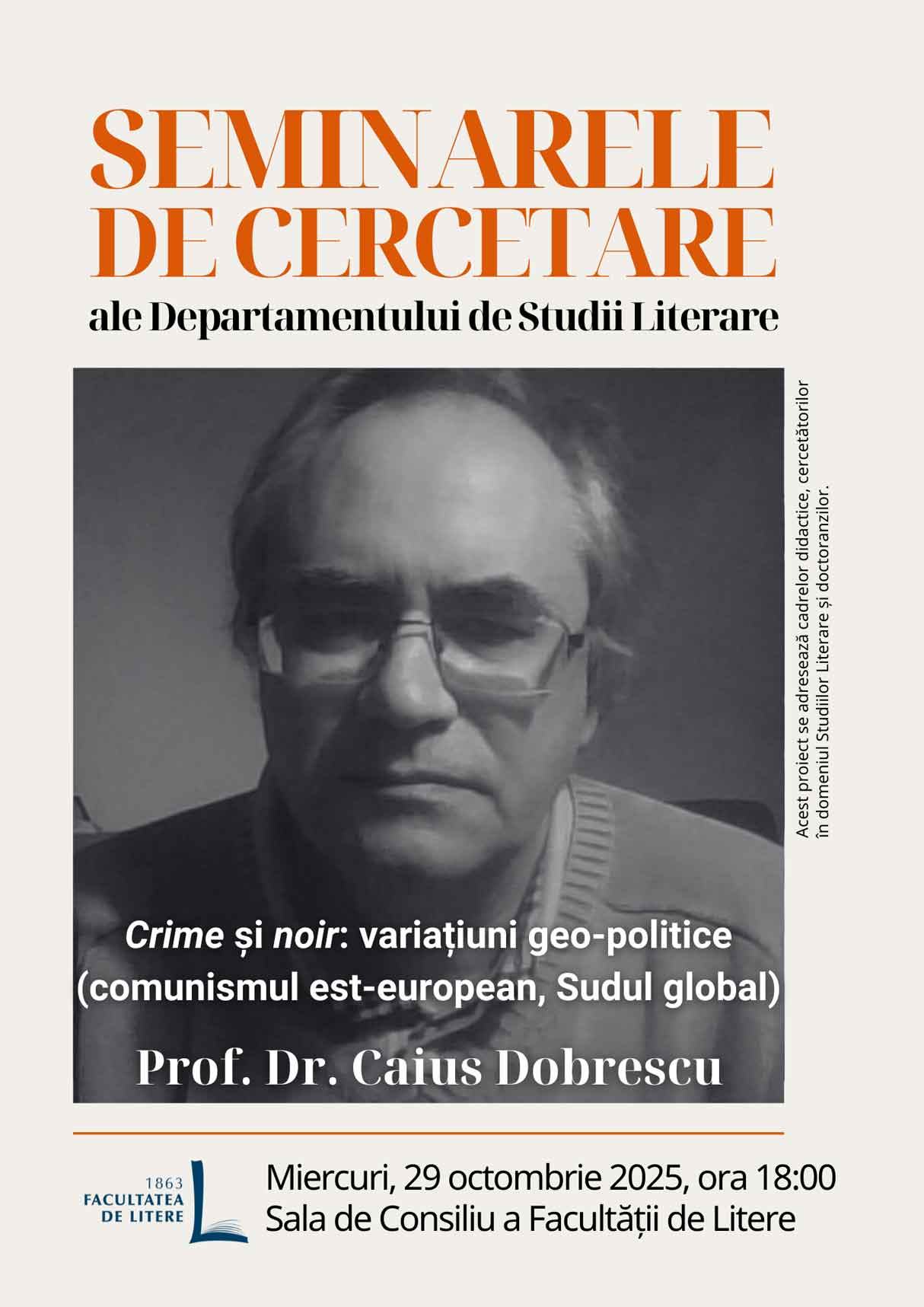 Vă așteptăm miercuri, 29 octombrie (ora 18:00, Sala de Consiliu), la primul Seminar de Cercetare al Departamentului de Studii Literare din acest an universitar. Invitatul nostru, prof. dr. Caius Dobrescu, ne va vorbi despre „Crime și noir: variațiuni geo-politice (comunismul est-european, Sudul global)”: