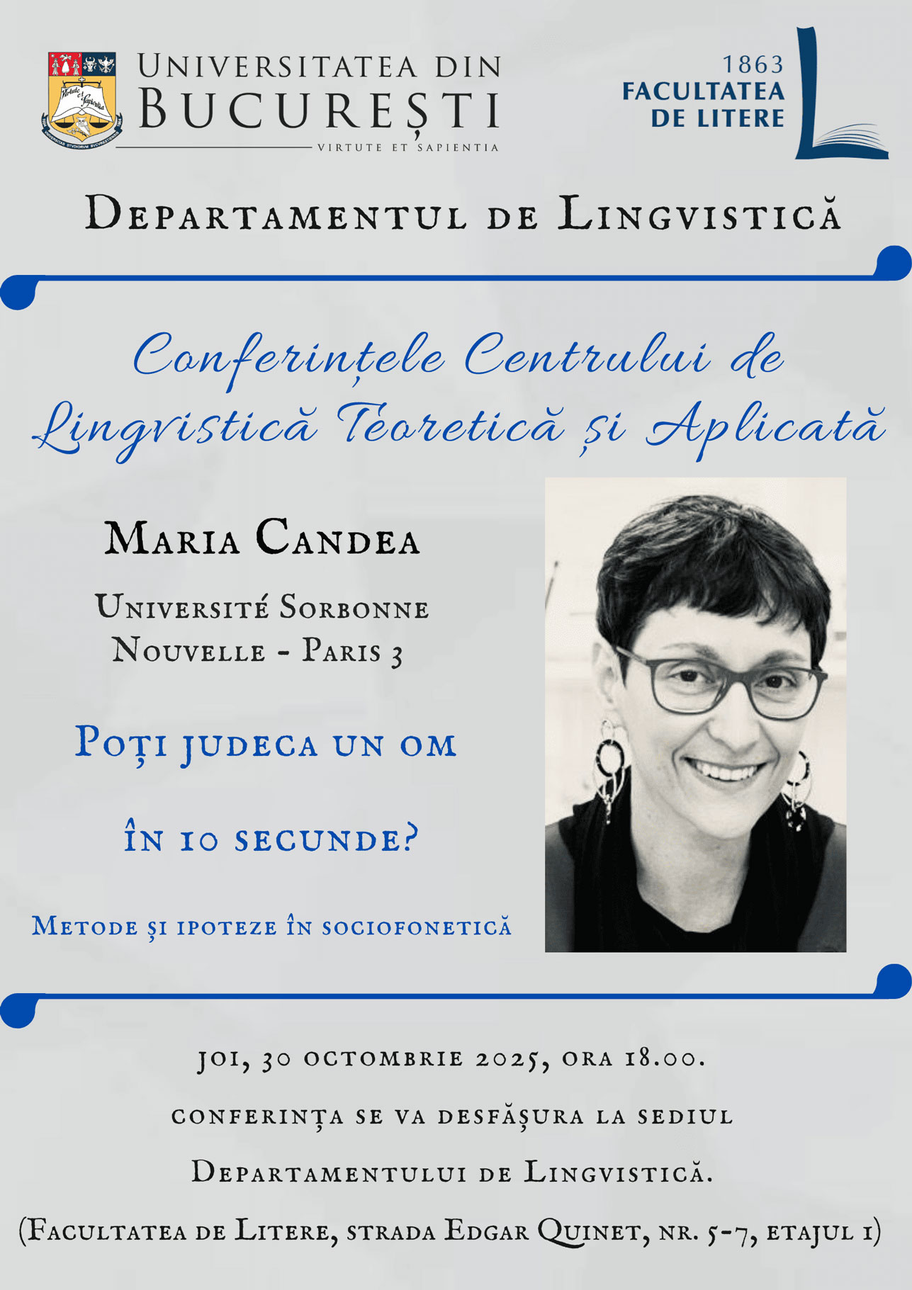 Conferința de joi o are ca invitată pe Maria Candea (Université Sorbonne Nouvelle – Paris 3), care va prezenta comunicarea Poţi judeca un om în 10 secunde? Metode și ipoteze în sociofonetică.