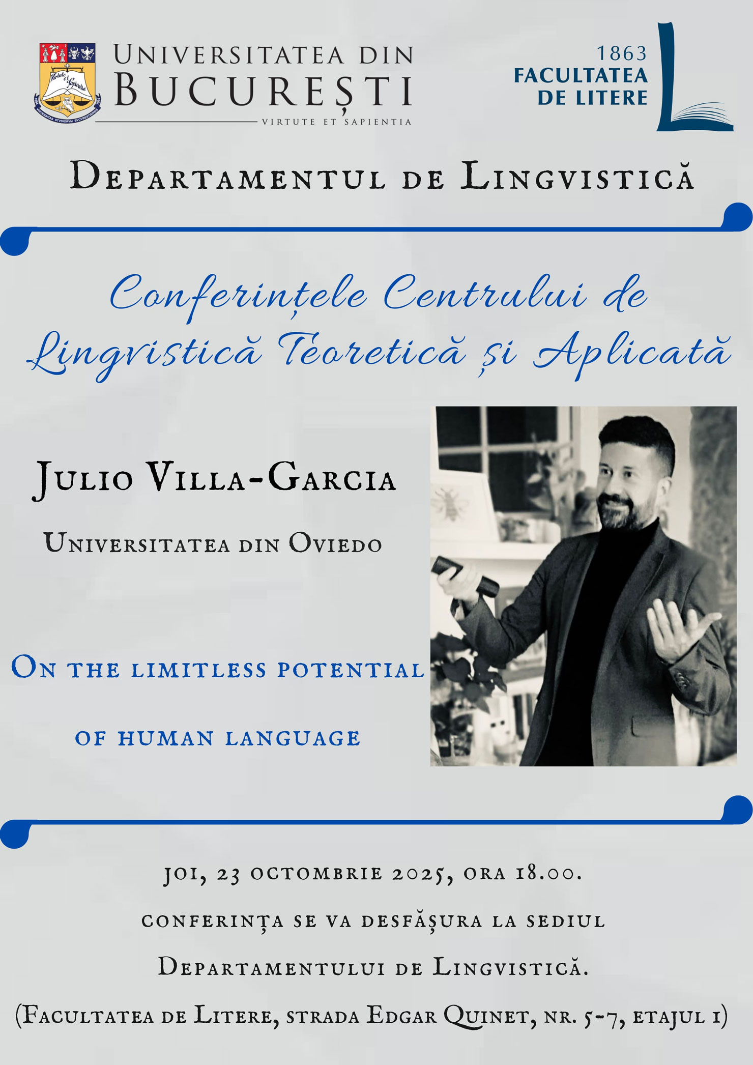 Prima conferință din acest an universitar din ciclul Conferințelor Centrului de Lingvistică Teoretică și Aplicată organizate de Departamentul de Lingvistică al Facultății de Litere se va desfășura joi, 23 octombrie 2025, la ora 18.00.